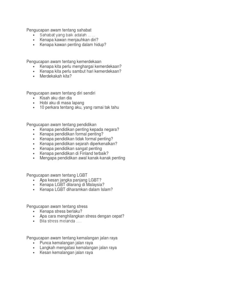 Contoh Pengucapan Awam Tentang Stress : 2. Antara tajuk lain yang popular adalah berkisar tentang pengucapan awam tentang haiwan dan juga pengucapan awam tentang sosial. Pengucapan awam tentang makanan seimbang. Stress/tekanan kepada kandungan ibu terutamanya dalam 3 bulan kehamilan; Maklumat tentang pekerjaan dan penempatan pekerjaan boleh di dapati dari: